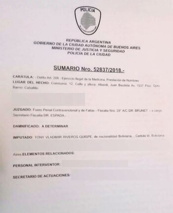 En el caso de Capital Federal, se repite el modus operandi empleado por los falsos médicos de Cañuelas. Tony Vladimir Riveros Quispe fue imputado por ejercicio ilegal de la medicina y prestación de nombres, es decir, desempeñarse con una identidad falsa en la clínica psiquiátrica "Emanuel".