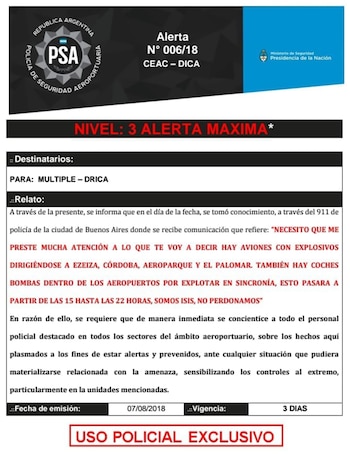 Fuentes de PSA confirmaron en diálogo con Infobae la existencia de la amenaza y explicaron que si bien a medida que pasan las horas todo indicaría que se trató de "una falsa alarma", el simple hecho del llamado "obliga a desplegar al personal" policial. En esa línea agregaron que la categoría de "alerta" que rige para todo el personal aeroportuario, sólo se extenderá hasta el final del día.