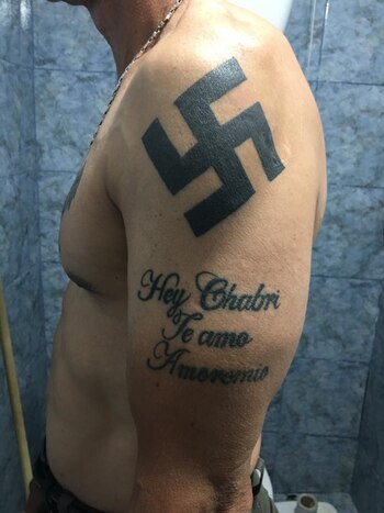 En algún punto, Neri comenzó a alimentar una obsesión por el nazismo. El soldado ejemplar enviado a la guerra durante una dictadura, encontró en otra, quizás la más terrible de todas, un lugar de identificación. Decidió llevarlo en la piel. Además de dos águilas imperiales sosteniendo esvásticas en su pecho y una cruz de hierro que oculta una relación fallida, en su cuerpo hay espacio para un mensaje de amor caótico: "Hey Chabri Te Amo Amoremio", se lee en su brazo izquierdo.