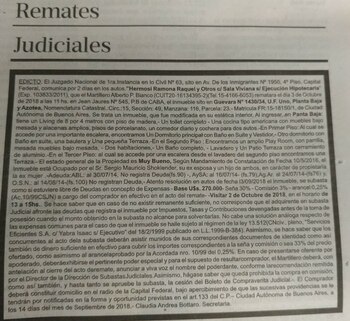 La subasta, a cargo del martillero Alberto Pantaleón Bianco, se concretó el 3 de octubre con una base de 270 mil dólares. Los compradores, Gabriela Eugenia Topalian y Fernando Angel Maresca, pagaron apenas 1.000 dólares más para quedarse con la vivienda donde Schoklender solía recibir a los periodistas en los meses posteriores al escándalo. En realidad, la operación se concretó con una seña de casi 80 mil dólares, depositados en una cuenta bancaria.