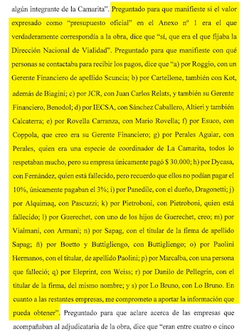 En la declaración -a la que Infobae accedió a través de fuentes judiciales- Clarens nombró a los contactos de las empresas Roggio, Rovella Carranza, Juan Carlos Relats, Esuco y Cartellone, entre otras tantas. En esa declaración Clarens también se comprometió a aportar los nombres de los contactos de todos los que combinaban con él el pago de las coimas.