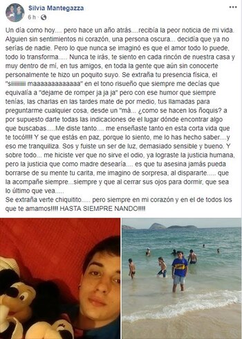 Silvia Mantegazza, la madre de Fernando, publicó en su perfil de Facebook un mensaje en el que recordó a su hijo y le dedicó duras palabras a la joven que cumple la condena en la Unidad Penal N° 6 de Paraná.