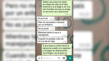 "Sabés una cosa vos estás en riesgo de vida porque él está enfermo y si te llega a ver con otro hombre así sea un amigo no sé cómo va a reaccionar", se lee en el mensaje que el domingo pasado le mandó Juan Carlos, vecino de su edificio, al que le respondió: "Sí, ya lo sé. Pero no me puedo ir del país por un enfermo".