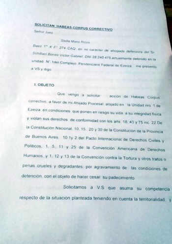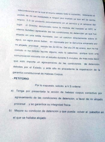 Su abogada Stella Maris Rizzo presentó un recurso de habeas corpus en el que denuncia que su defendido "se encuentra en peores condiciones de detención, en una celda inundada, sin agua para beber y con un colchón inutilizable".