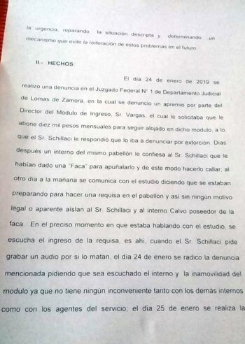 Schillaci denunció el 24 de enero ante el Juzgado Federal Número 1 de Lomas de Zamora que un guardia le pidió diez mil pesos por mes por su seguridad.