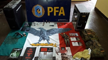 El resultado: se detuvo a los dos investigados, padre e hijo de nacionalidad argentina, y se incautaron un revolver calibre .22, gran cantidad de munición, folletos e insignias con la esvástica nazi, libros de Adolf Hitler, banderas del fascismo italiano, prendas de vestir de tipo militar con la bandera alemana, computadoras, teléfonos celulares y más elementos de interés para la causa, según dejaron saber fuentes policiales.