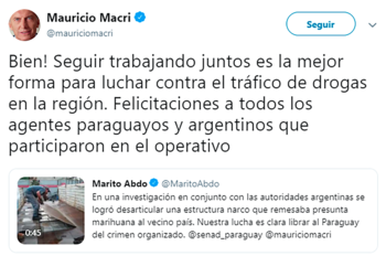 Poco después, llegó la respuesta del presidente argentino: "Bien! Seguir trabajando juntos es la mejor forma para luchar contra el tráfico de drogas en la región. Felicitaciones a todos los agentes paraguayos y argentinos que participaron en el operativo".