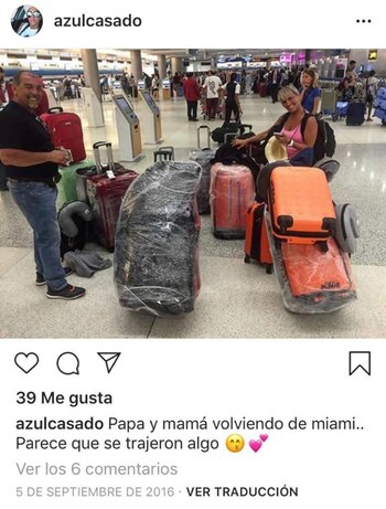 Otra de las fotos que más llamaron la atención fue cuando retrató a sus padres en el aeropuerto de Ezeiza, a la vuelta de un viaje a Miami, donde bromeaba por la decena de valijas que se habían traído: "Papá y Mamá volviendo de Miami…parece que se trajeron algo".