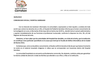Una aclaración importante que hicieron los referentes del centro de salud es la siguiente: "La fiscalía confirmó durante el día de ayer que hasta el momento no existe en el material incautado imágenes ni videos que se correspondan con locaciones dentro del Hospital Garrahan".