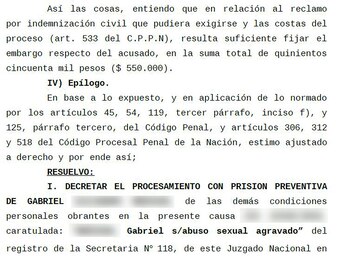 La jueza Provítola consideró que la materialidad de los hechos está acreditada y que todos los datos que brindó la menor fueron corroborados. En sus cálculos, lo que dice Gabriel A. no tiene sustento, ya que "mediante una simple suma" se podía dar cuenta de que en todo el tiempo que vivieron en el mismo terreno, al compartir espacios comunes, el hombre podría haber cruzado a la casa aproximadamente más de 6 mil veces en todo el tiempo en que ocurrieron los abusos, por lo que sería "altamente improbable" que siempre hubiera alguien presente además de él y la menor. Entendió que esa explicación no alcanzaba para desestimar el relato de la joven. Además de procesarlo con prisión preventiva, Provítola lo embargó también por 500 mil pesos.