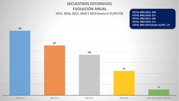 La caída continuó acentuándose hasta su piso histórico este año: durante un lapso de más de 7 meses, se registró un total 27 secuestros—siempre de corta duración y sin inteligencia previa—, con un promedio de 4 interceptaciones al mes con exigencias de rescates. En lo que va de agosto, no hubo víctimas en cautiverio a cambio de pagos. La estadística de 2019 incluye los casos de secuestros a miembros de bandas narco, en los que los rescates se saldan con droga y efectivo.