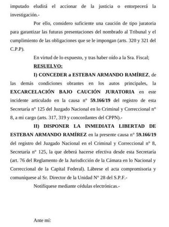 Según se desprende del texto de la excarcelación, Bernán consideró que no existen razones para creer que "el imputado eludirá el accionar de la Justicia o entorpecerá la investigación", por lo que resolvió su inmediata "excarcelación bajo caución juratoria".