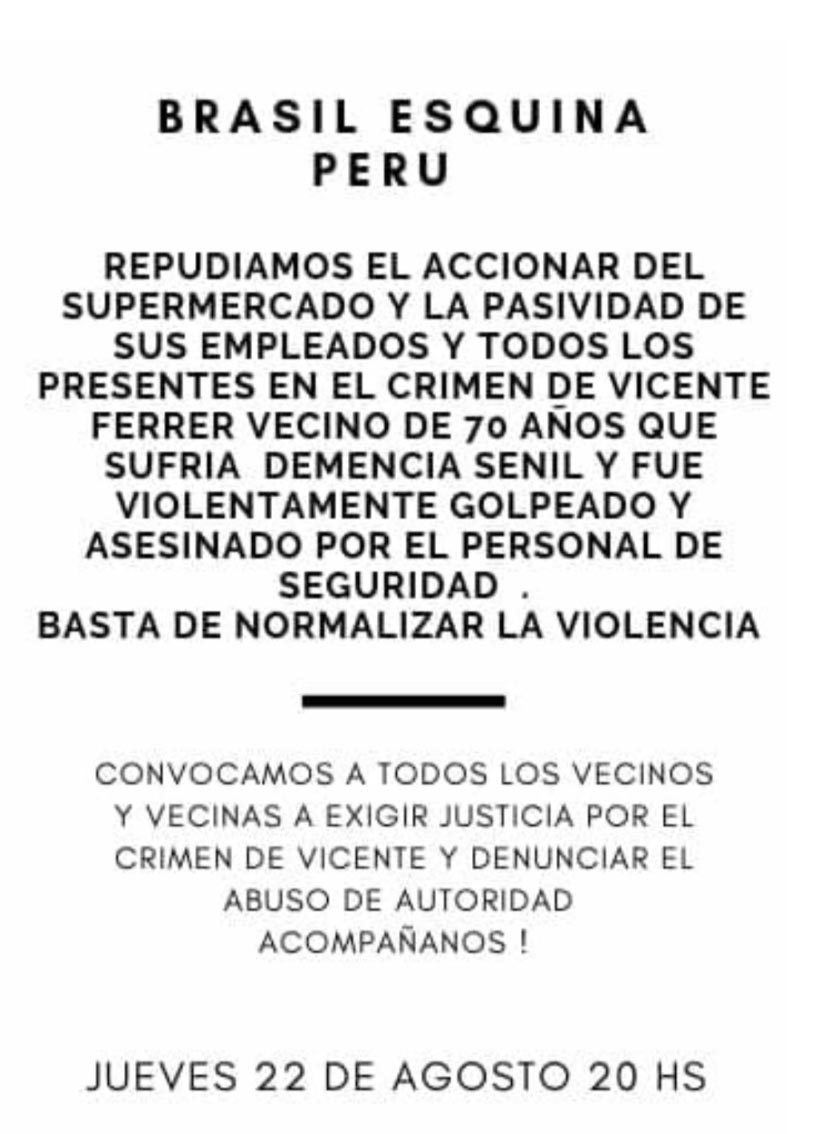Los vecinos de Ferrer convocaron a manifestarse en la puerta del supermercado de San Telmo, en repudio al accionar del local y exigiendo justicia por la muerte, este jueves a las 20 horas.