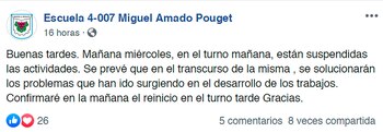 A través de su cuenta de Facebook, la escuela Pouget publicó un comunicado para llevar tranquilidad a las familias de los alumnos.