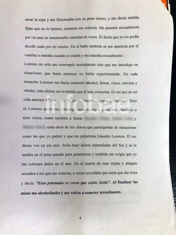 -"Padecí por parte de Lorenzo muchos actos abusivos con acceso carnal haciendo abuso de su condición de sacerdote y de sus necesidades".