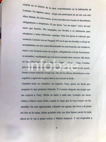-"En muchas ocasiones me forzó a tener relaciones en el marco de un trío. En algunos casos exigía que participara de un trío con otro chico Matías. En otros casos se me acercaba con el pene al descubierto obligándome a chupárselo".