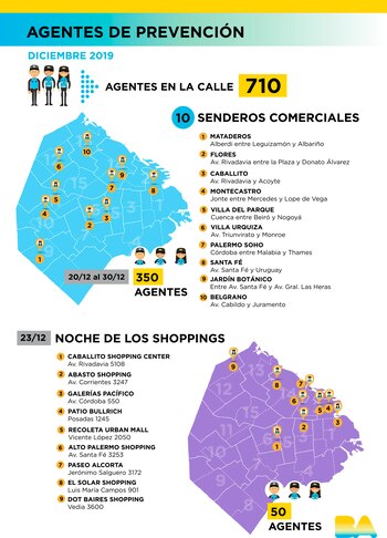 Según se informó, unos 350 agentes estarán destinados a los senderos comerciales de barrios como Caballito, Belgrano, Monte Castro, Mataderos, Villa Urquiza, Flores, Palermo Soho, Villa del Parque, el corredor de la avenida Santa Fe y el Jardín Botánico, hasta el 31 de diciembre entre 11 y 21 horas. En tanto, desde la Policía de la Ciudad se reforzarán estas zonas con la presencia de motos y personal de a pie que recorrerá las zonas comerciales.