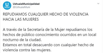 Desde la Municipalidad de la capital fueguina repudiaron el accionar del patovica: “Estamos en total desacuerdo con cualquier hecho de violencia contra las mujeres”. En ese sentido, desde la Secretaría de la Mujer convocaron “a seguir trabajando para discutir y planificar en conjunto políticas de prevención y erradicación de la violencia machista. Nos ponemos a disposición y estamos al servicio del esclarecimiento del lamentable hecho”, informaron desde el organismo municipal.