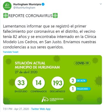 “Lamentamos informar que se registró el primer fallecimiento por coronavirus en el distrito, el vecino tenía 82 años y se encontraba internado en la Clínica Modelo Los Cedros, en San Justo. Enviamos nuestras condolencias a sus seres queridos”, tuiteó la cuenta oficial de ese partido del Gran Buenos Aires.