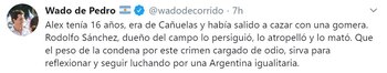 “Alex tenía 16 años, era de Cañuelas y había salido a cazar con una gomera. Rodolfo Sánchez, dueño del campo, lo persiguió, lo atropelló y lo mató. Que el peso de la condena por este crimen cargado de odio, sirva para reflexionar y seguir luchando por una Argentina igualitaria”, escribió el dirigente en su cuenta de Twitter.