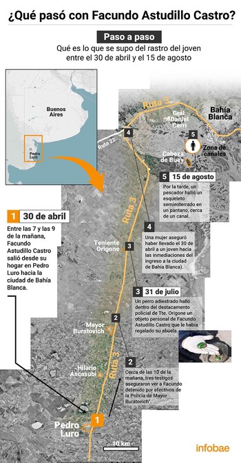 “Hay que establecer la coordinación con Bahía Blanca. La última actividad que registra el teléfono de Facundo es el 1 de mayo a las 10 en el centro de Bahía Blanca, a 100 metros de la UPPL. Ahí se prende el teléfono, sale señal, la capta en dirección a la comisaría, rebota por falta de crédito y se apaga para siempre”, detalla Peretto.