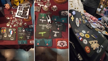 Se incautaron 70 insignias metálicas, 3 anillos metálicos, 62 distintivos y otros 76 elementos fabricados con el mismo material, todos ellos distribuidos en tres compartimientos diferentes según fuentes policiales. Además, se encontraron sobres que contenían 8 DVDs, un catálogo con insignias nazis, 25 parches de tela, 3 hojas con símbolos nazis, un águila de metal, un plato con insignias metálicas y un cenicero también con símbolos del Tercer Reich, con imitaciones de condecoraciones militares.
