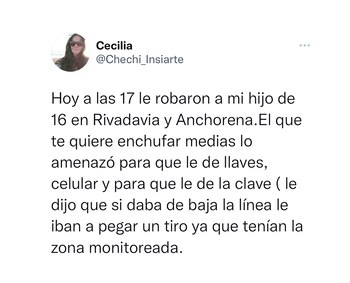 “Hoy a las 17 le robaron a mi hijo de 16 en Rivadavia y Anchorena. El que te quiere enchufar medias lo amenazó para que le de llaves, celular y para que le de la clave. Le dijo que si daba de baja la línea le iban a pegar un tiro ya que tenían la zona monitoreada”, tuiteó Cecilia Insiarte.