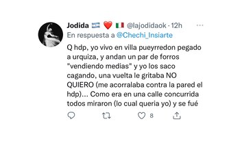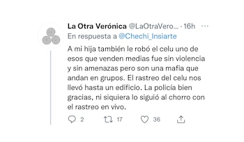 Mientras que otra agregó: “A mi hija también le robó el celu uno de esos que venden medias. Fue sin violencia y sin amenazas pero son una mafia. El rastreo del celu nos llevó hasta un edificio. La policía, bien gracias, ni siquiera lo siguió al chorro con el rastreo en vivo”.