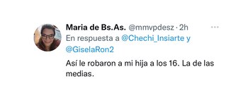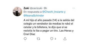 “A mi hijo, de 14 años, a la salida del colegio, un vendedor de medias le robó el celular y la billetera. Le dijo que si se resistía le iba a pegar un tiro. Las Heras y Coronel Díaz”, se lamentó otra mamá que se sumó a la catarsis virtual de Cecilia.