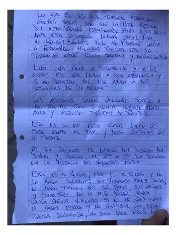 “Todavía están a tiempo de salvar sus almas”. Ese fue el mensaje que Marcos Acevedo quiso decirle a la cara a los rugbiers acusados del crimen de Fernando Báez Sosa. Aunque no pudo hacerlo al declarar en la sala de los tribunales de Dolores como testigo, pero la compartió con los medios. Infobae accedió a ese texto, con pasajes que son dramáticos.
