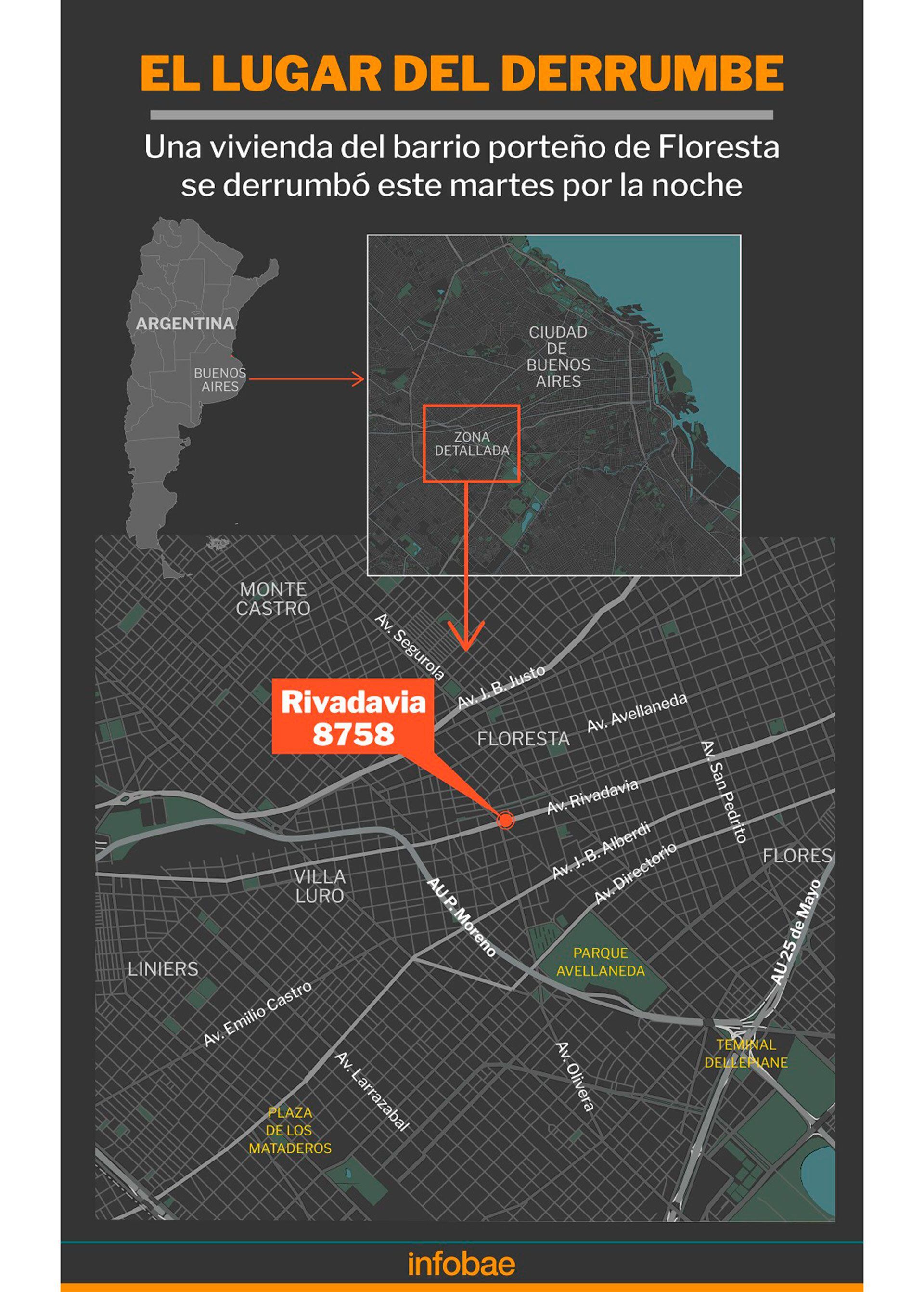 Una vivienda del barrio porteño de Floresta se derrumbó este martes por la noche. Decenas de ambulancias, policías, bomberos y personal de Defensa Civil acudieron al lugar, donde se confirmaron dos víctimas fatales: una niña de 12 años y un joven de 19 (primero había trascendido que ser trataba de un hombre 35 años). Hubo varias personas atrapadas bajo los escombros en el interior de la vivienda. Rescataron a dos menores de edad que fueron trasladados a hospitales y están fuera de peligro, pero los rescatistas todavía buscan a tres personas desaparecidas.
