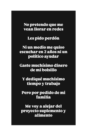 “No pretendo que me vean llorar en redes. Les pido perdón. Ni un medio me quiso escuchar en dos años ni un político ayudar. Gasté muchísimo dinero de mi bolsillo. Y dediqué muchísimo tiempo y trabajo”, lamentó. Y en ese mismo posteo, anunció: “Pero por pedido de mi familia, me voy a alejar del proyecto suplemento y alimento”.