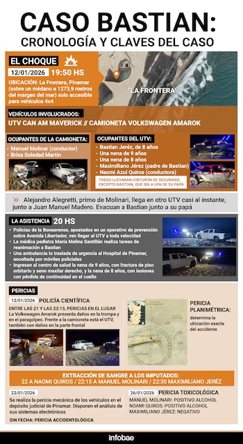 Tras los resultados de la pericia toxicológica-química de la causa Bastian, la investigación en manos del fiscal Sergio García avanza hacia la prueba accidentológica, con miras a las indagatorias de los imputados: Manuel Molinari, Noami Quiros, ambos conductores de los vehículos involucrados, una Volkswagen Amarok y un UTV CAN AM, respectivamente; y Maximiliano Jérez, padre del chico de 8 años gravemente herido en el choque frontal en La Frontera, en Pinamar.