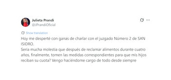 “Hoy me desperté con ganas de charlar con el Juzgado Número 2 de San Isidro. ¿Sería mucha molestia que, después de reclamar alimentos durante cuatro años, finalmente tomen las medidas correspondientes para que mis hijos reciban su cuota? Vengo haciéndome cargo de todo desde siempre”, posteó Prandi en su cuenta de “X”.