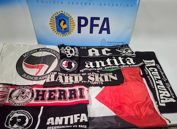 Entre los objetos secuestrados se encontraban banderas con inscripciones antifascistas, banderas del movimiento Antifa, 12 pines con amenazas contra el presidente Javier Milei y otros funcionarios, junto a banderas de Palestina.