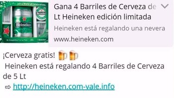 En los últimos días se viralizó un mensaje por WhatsApp que dice que Heineken ofrece 4 barriles de cerveza gratis a quien participe de una encuesta siguiendo un link que acompaña el texto. Se trata de un engaño.
