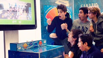 En el hall de entrada del colegio hay una colorida puesta en escena que incluye, por ejemplo, una pantalla, una cámara, emojis e invita a los alumnos a acercarse a través del mensaje: "Demostrá tu pasión por la selección".