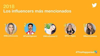 En cuarto lugar está Flor Vigna que estas semanas estuvo en el centro de atención tras las peleas con Laurita Fernández y en el quinto lugar figura Jimena Barón, que este año tuvo un crecimiento meteórico como cantante.