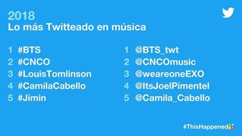 En el rubro musical, los grupos que fueron tendencia son BTS y CNCO; seguidos por Louis Tomlinson y Camila Cabello. El top five se completa con el cantante y bailarín surcoreano Ji-Min.