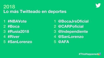 En el fútbol, el equipo más mencionado fue Boca, seguido por River y luego San Lorenzo. Por supuesto, el hashtag Rusia 2018 también se destacó en el entorno digital, haciendo referencia al Mundial que se jugó este año.