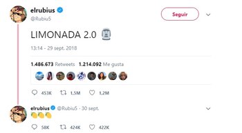 El tuit más retuiteado fue "Limonada 2.0" que publicó el famoso Rubius. De esa manera el youtuber anunciaba su regreso al ruedo, luego de un descanso de cuatro meses. Este texto fue retuiteado 1,5 millones de veces.