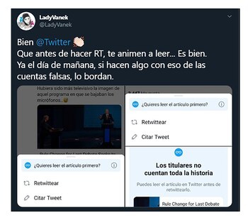 Este cambio se engloba dentro de una serie de medidas que desde la empresa aseguran que ayuda contra la desinformación a medida que se acercan los comicios. Desde junio, por ejemplo, una buena cantidad de usuarios notó que al momento de querer hacer retuit a una noticia, se desplegaba un recordatorio con la leyenda “Los titulares no cuentan la historia completa”.