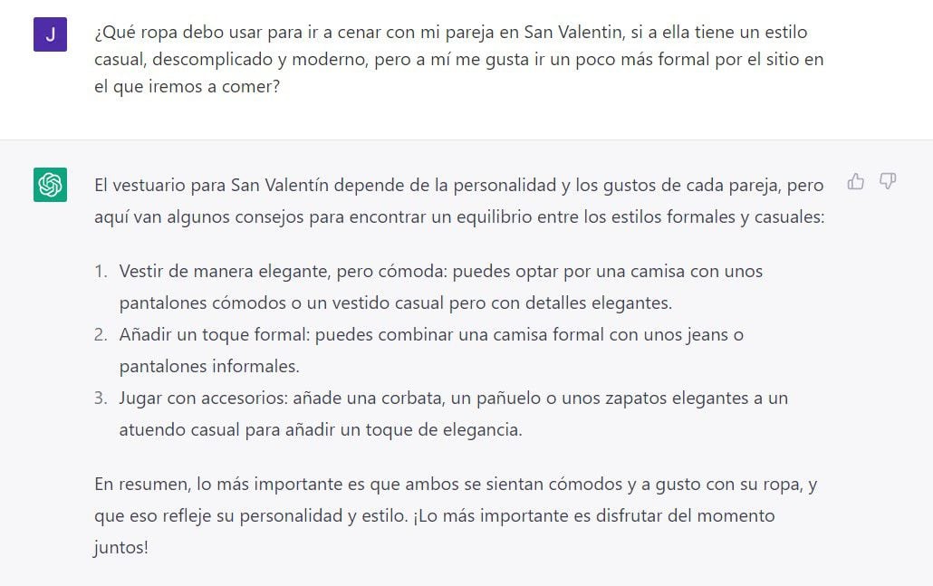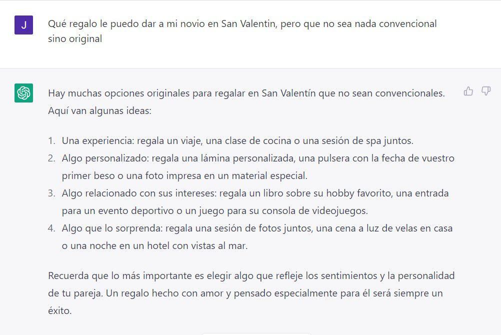 El avance de la inteligencia artificial permite tener hoy una herramienta como ChatGPT que genera textos a partir de una petición y una de sus opciones es solicitarle consejos o tips para ciertas situaciones. En este caso San Valentín.