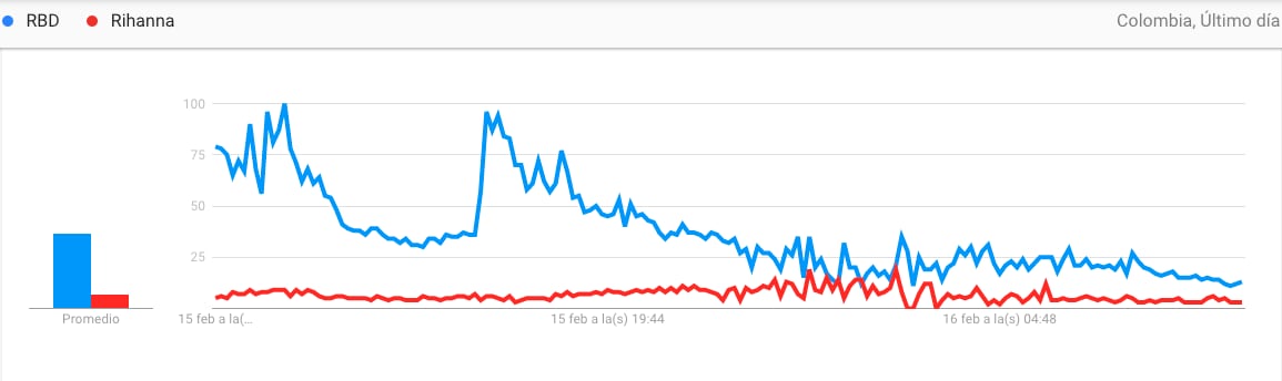 “En los últimos 7 días, RBD se ha convertido en el grupo musical más buscado en Colombia, con un aumento del +950%. Las búsquedas han superado incluso a Rihanna, con los colombianos buscando RBD 6 veces más que Rihanna en el último día”, indicó Google Trends.
