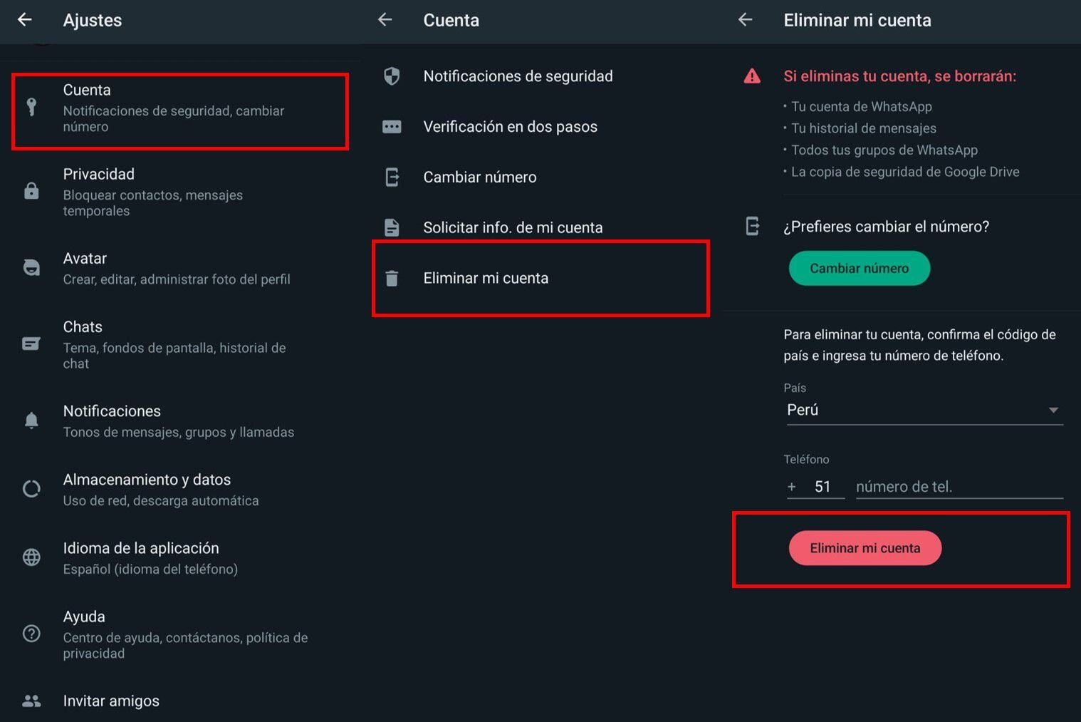 Al ingresar a esta opción, el sistema volverá a recordar al usuario la información que no volverá a ver (cuenta, historial de mensajes, grupos y copia de seguridad), además de establecer una opción alternativa a la eliminación, que es el Cambio de número. De esta forma los usuarios podrán dejar de usar su perfil en el celular actual para pasar a uno diferente.