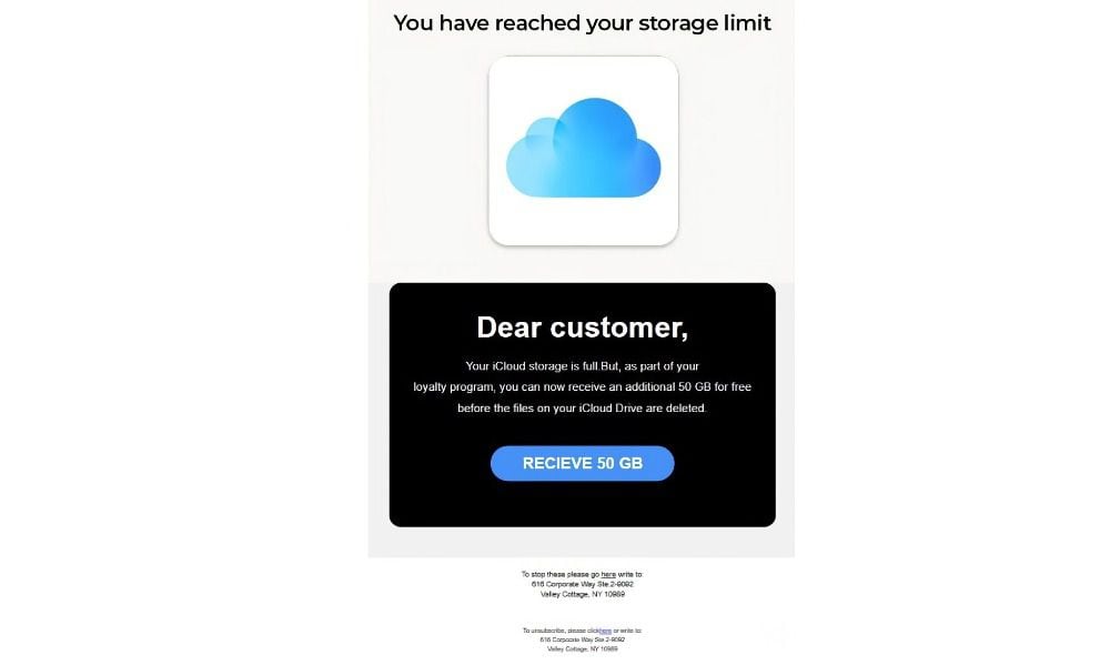 El correo electrónico que utilizan los criminales indica que los usuarios han alcanzado el límite de la capacidad de almacenamiento en iCloud, pero que coincidentemente forma parte de un programa de fidelidad. Esta supuesta oferta brindará 50 gigabytes de espacio extra al usuario de forma gratuita y lo único que debe hacer es acceder a su cuenta con su correo y contraseña.