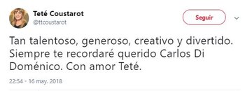 "Tan talentoso, generoso, creativo y divertido. Siempre te recordaré", publicó la periodista y empresaria Teté Coustarot.