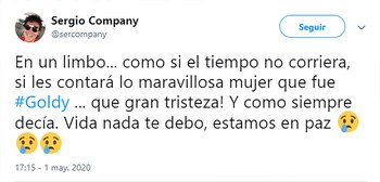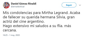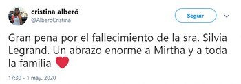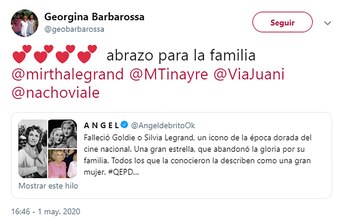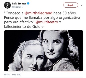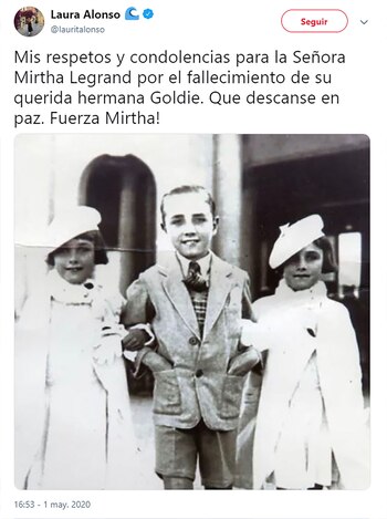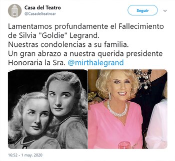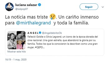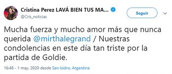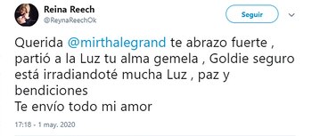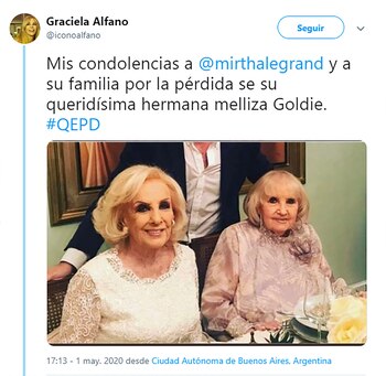 Asimismo, Graciela Alfano escribió: “Mis condolencias a @mirthalegrand y a su familia por la pérdida de su querídisma hermana melliza Goldy. #QEPD”.