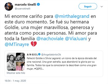Ese fue el caso de Marcelo Tinelli, quien escribió un sentido mensaje en su cuenta en Twitter: “Mi enorme cariño para @mirthalegrand en este duro momento. Se fue su hermana, Goldy, una mujer maravillosa, generosa y atenta como pocas. mi amor para toda la familia @nachoviale @vialejuani y @matinayre”.