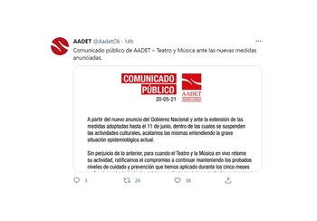Desde la Asociación Argentina de Empresarios Teatrales (AADET) emitieron un comunicado diciendo que “acatarán las medidas entendiendo la grave situación epidemiológica” y renovaron su compromiso de mantener los cuidados necesarios para evitar contagios una vez que se pueda regresar a la actividad.